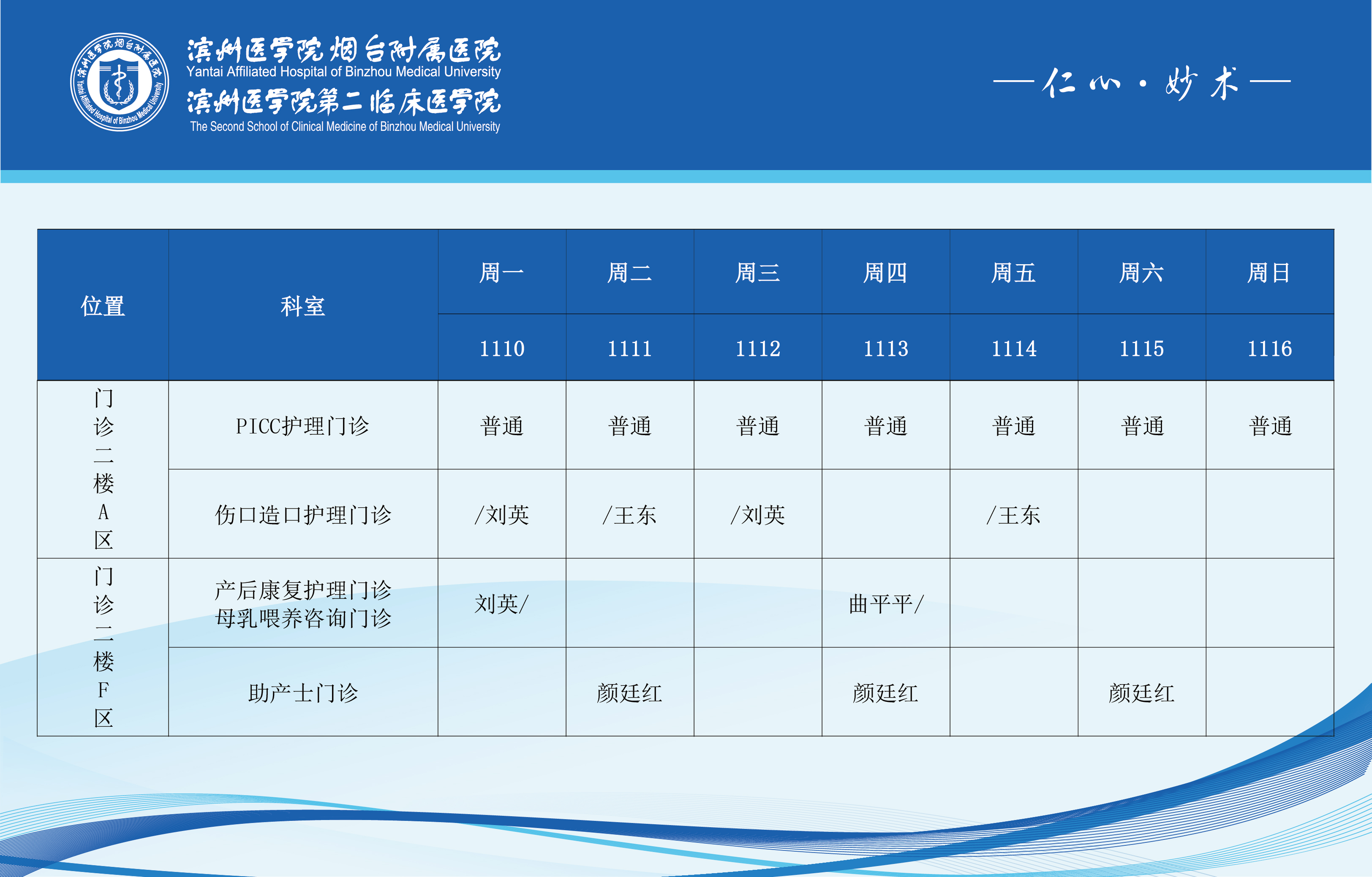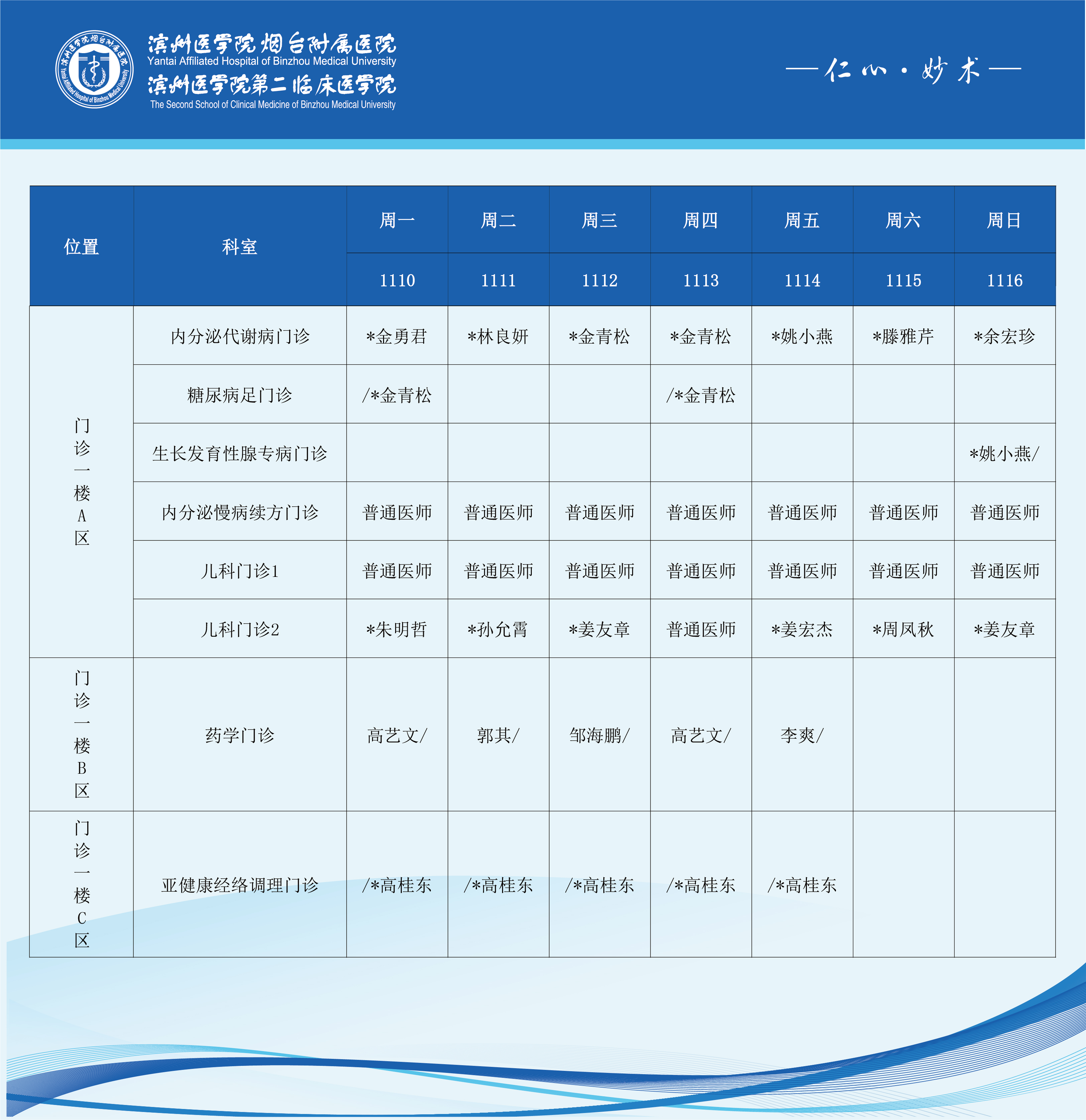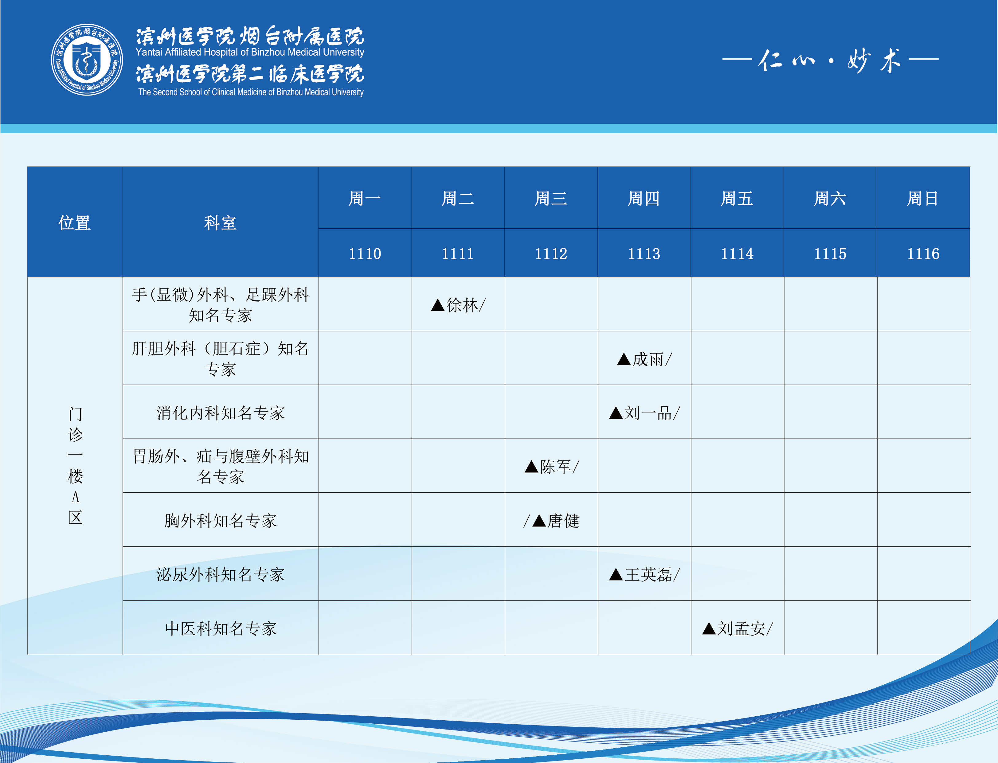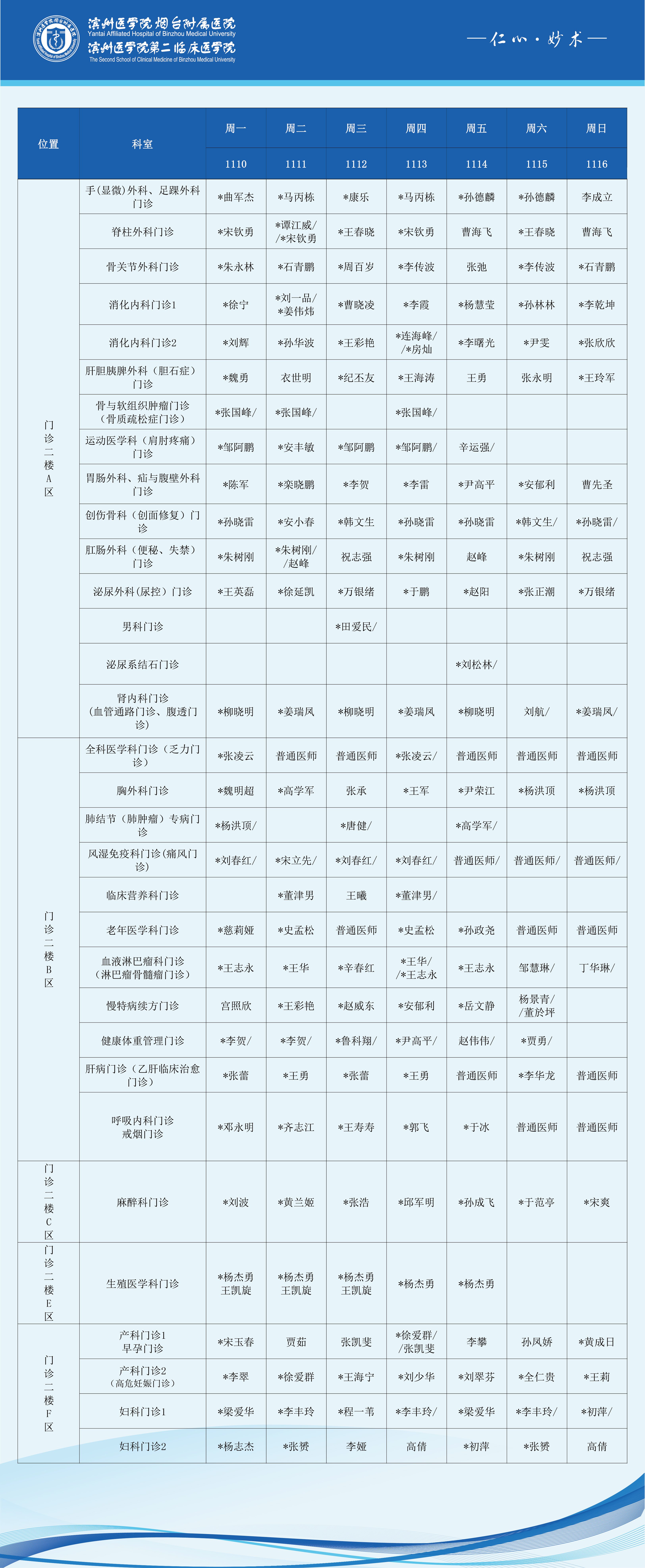 滨州医学院烟台附属医院2025年11月10日-11月16日门诊医师坐诊表