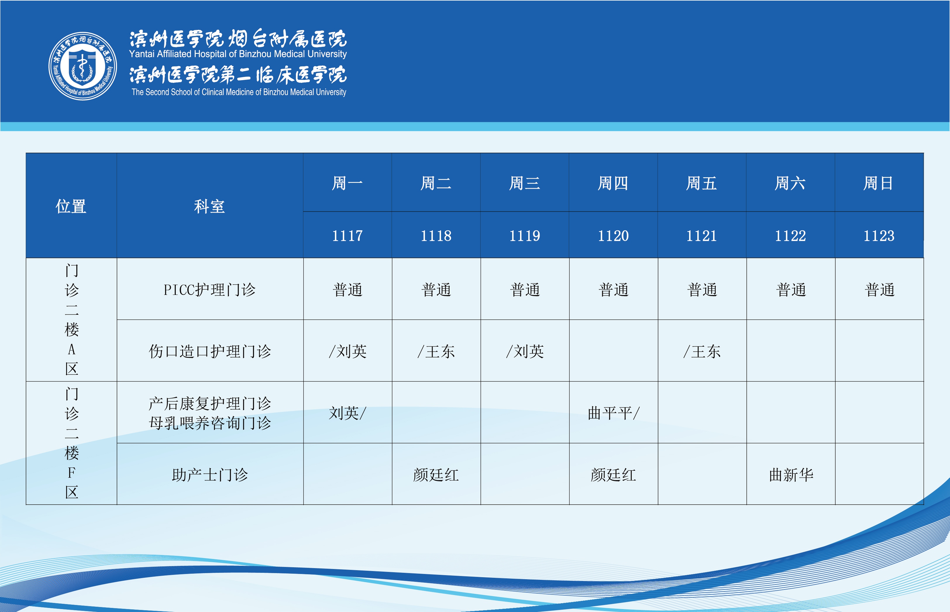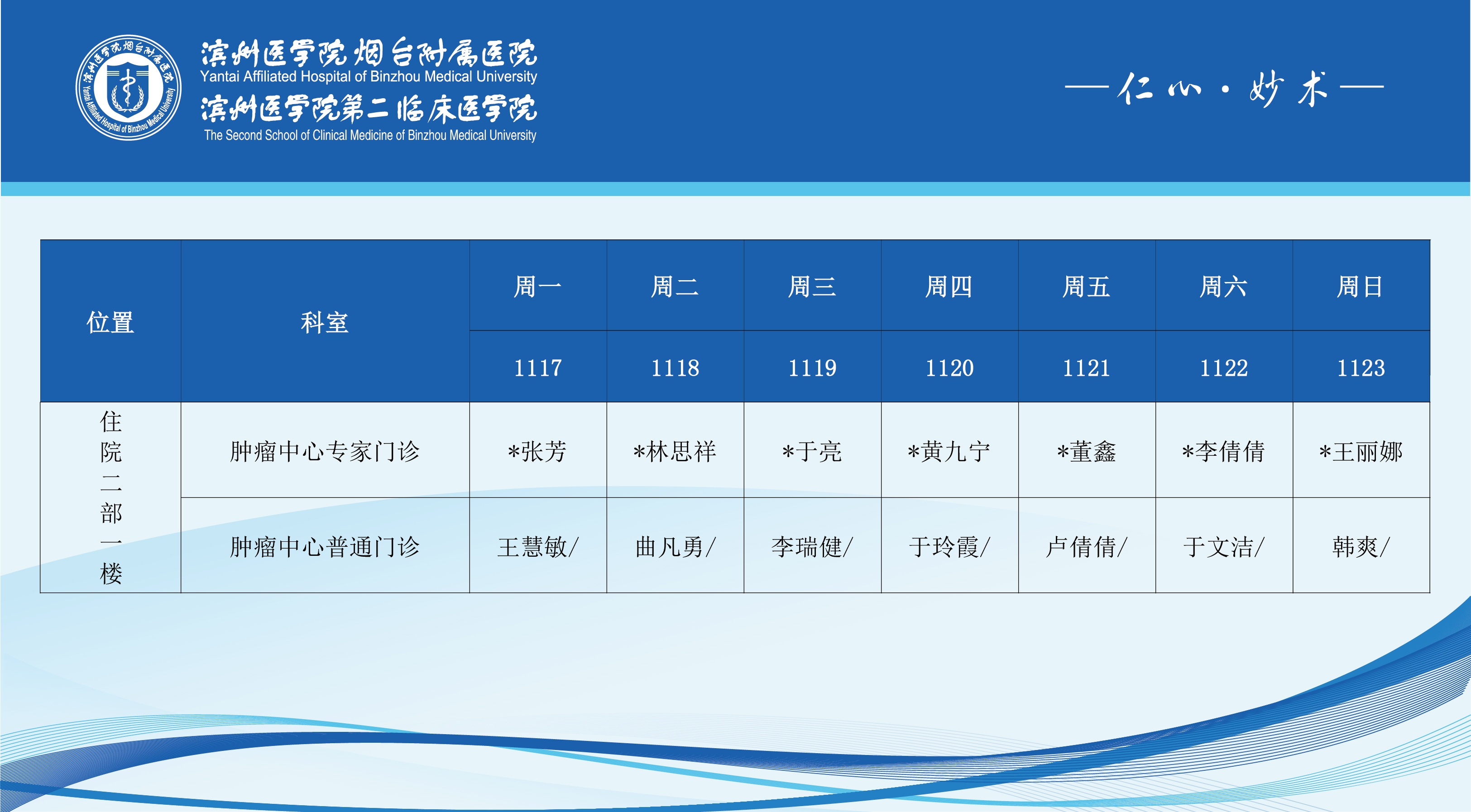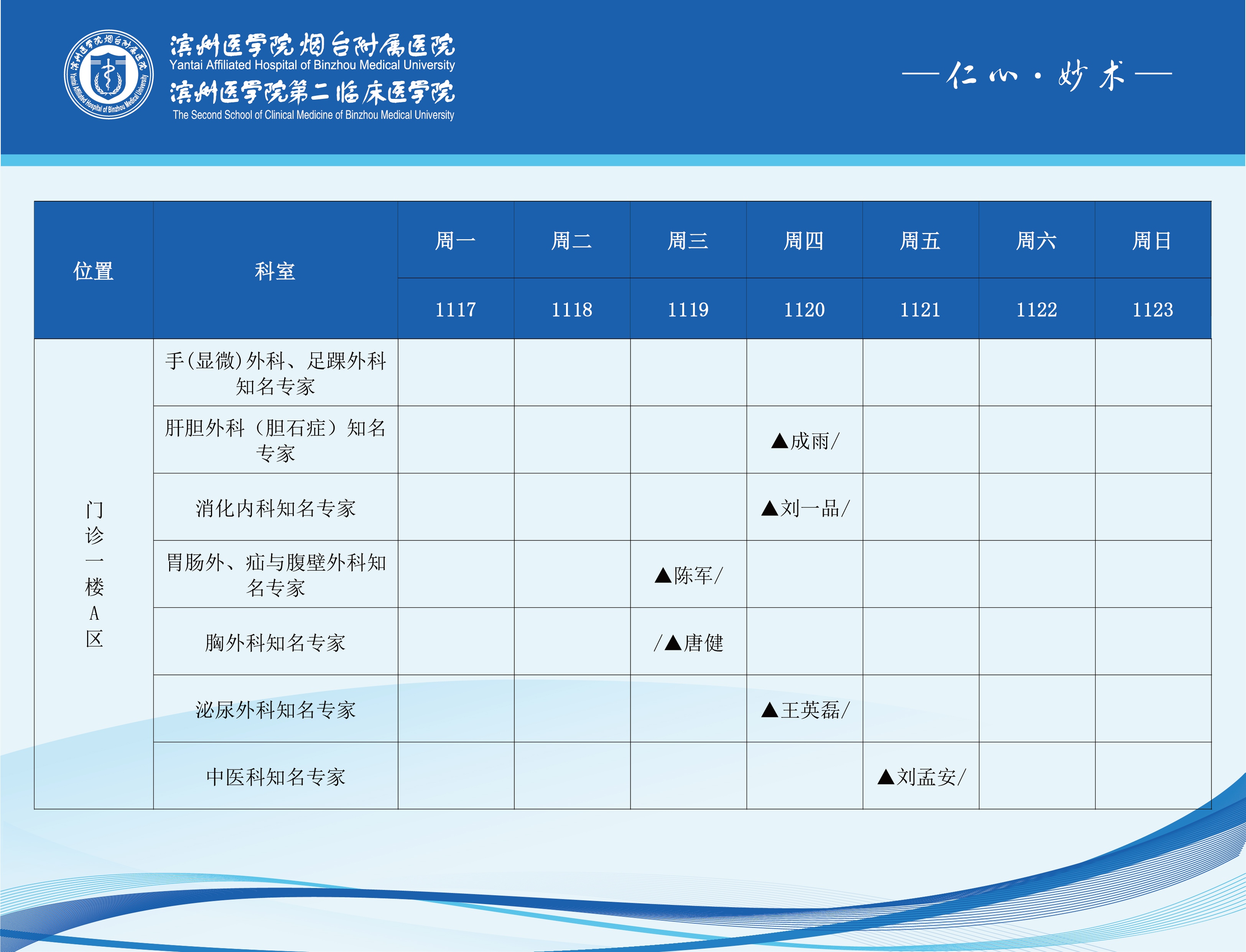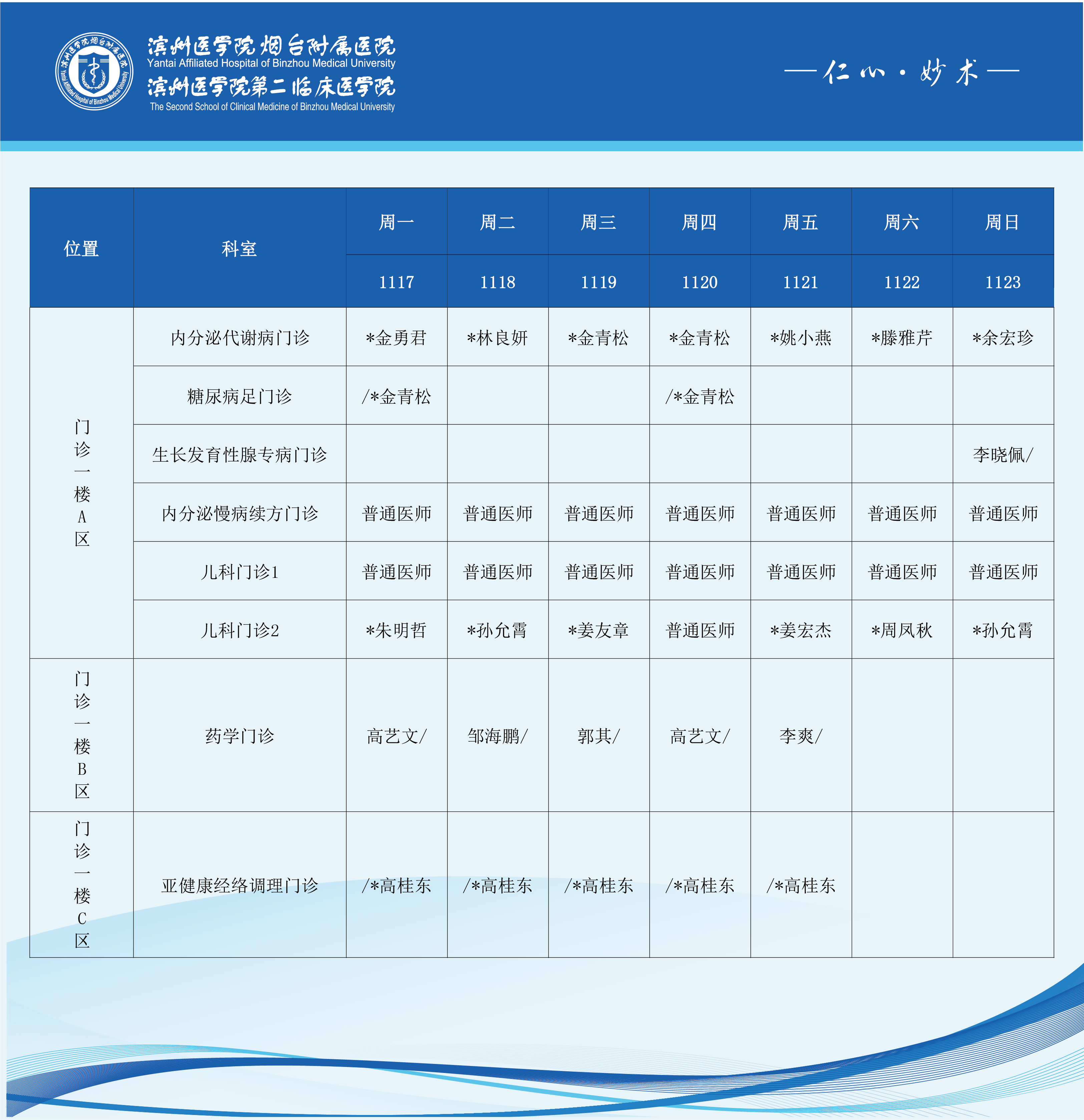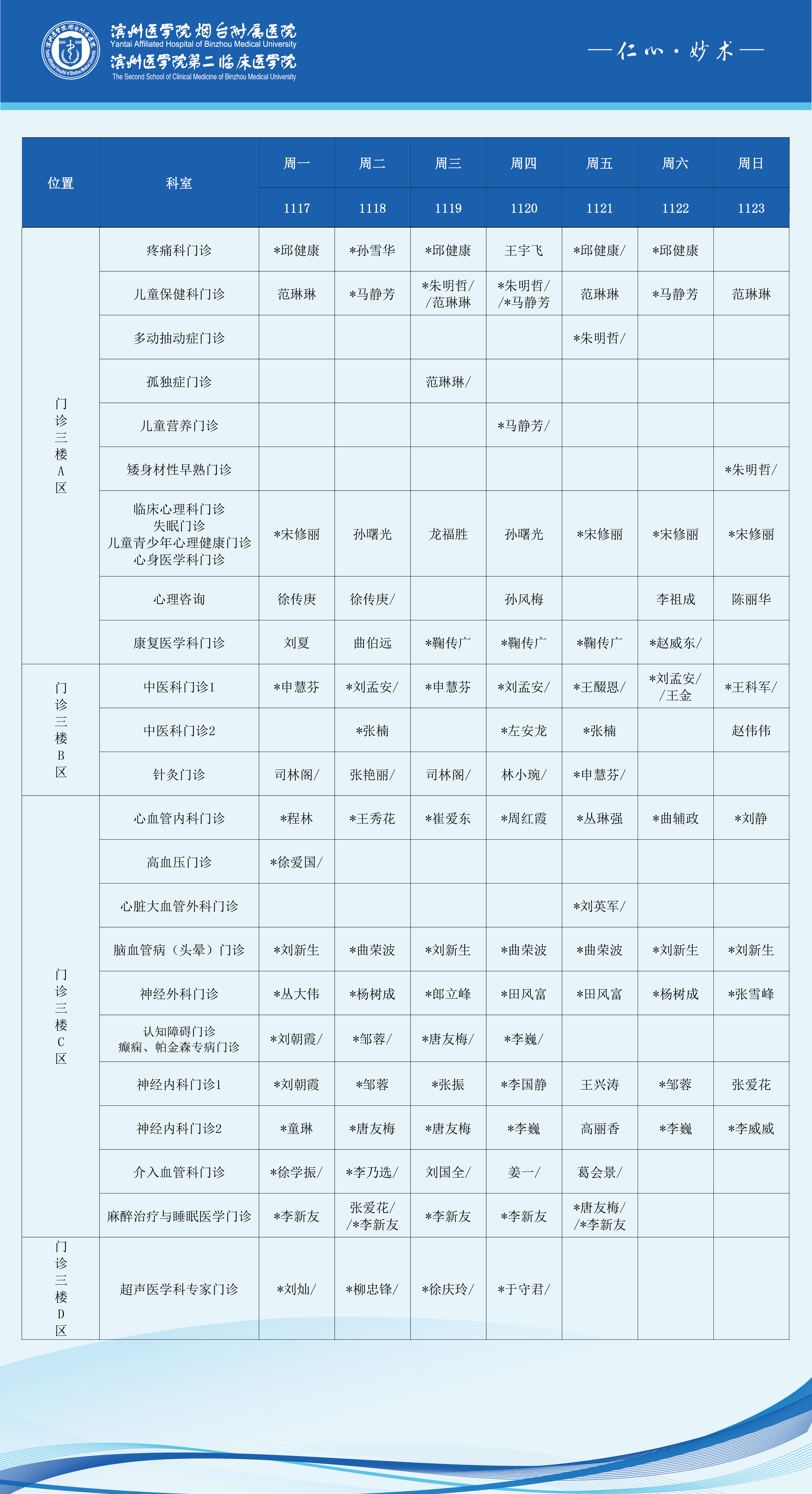 滨州医学院烟台附属医院2025年11月17日-11月23日门诊医师坐诊表