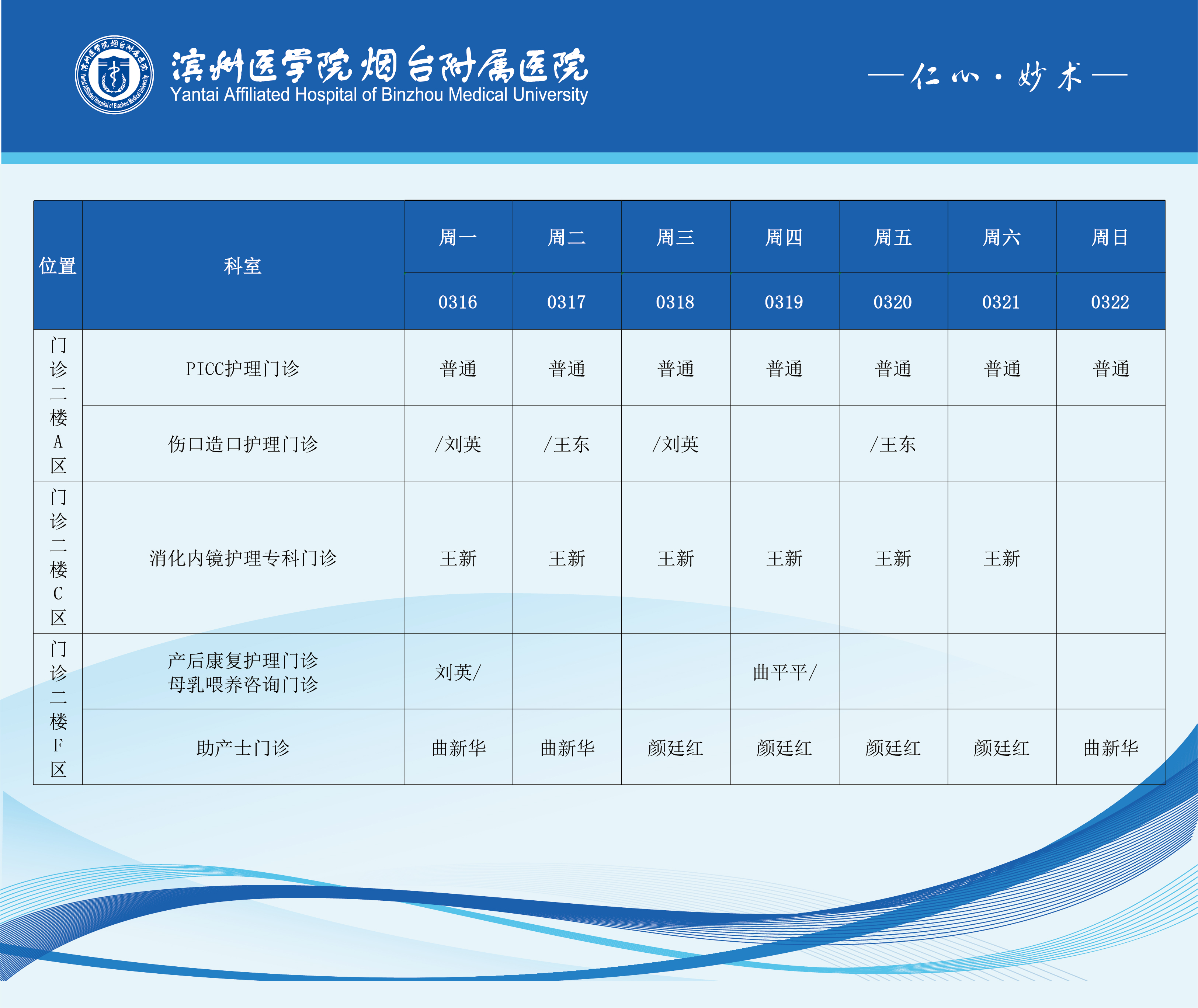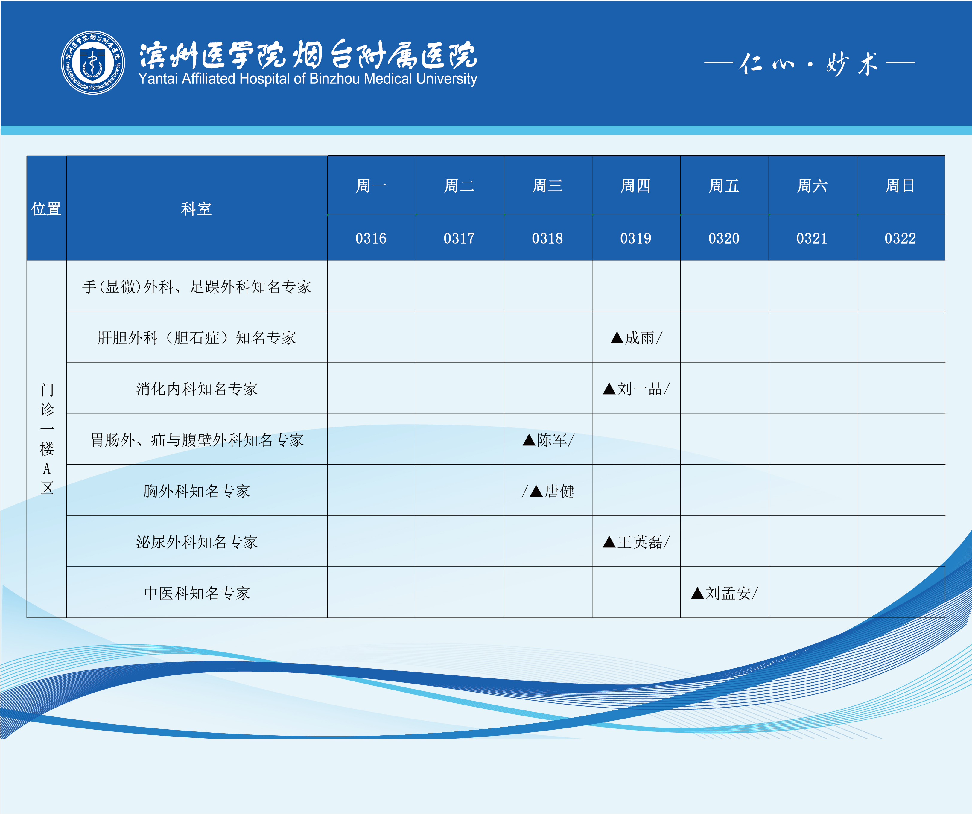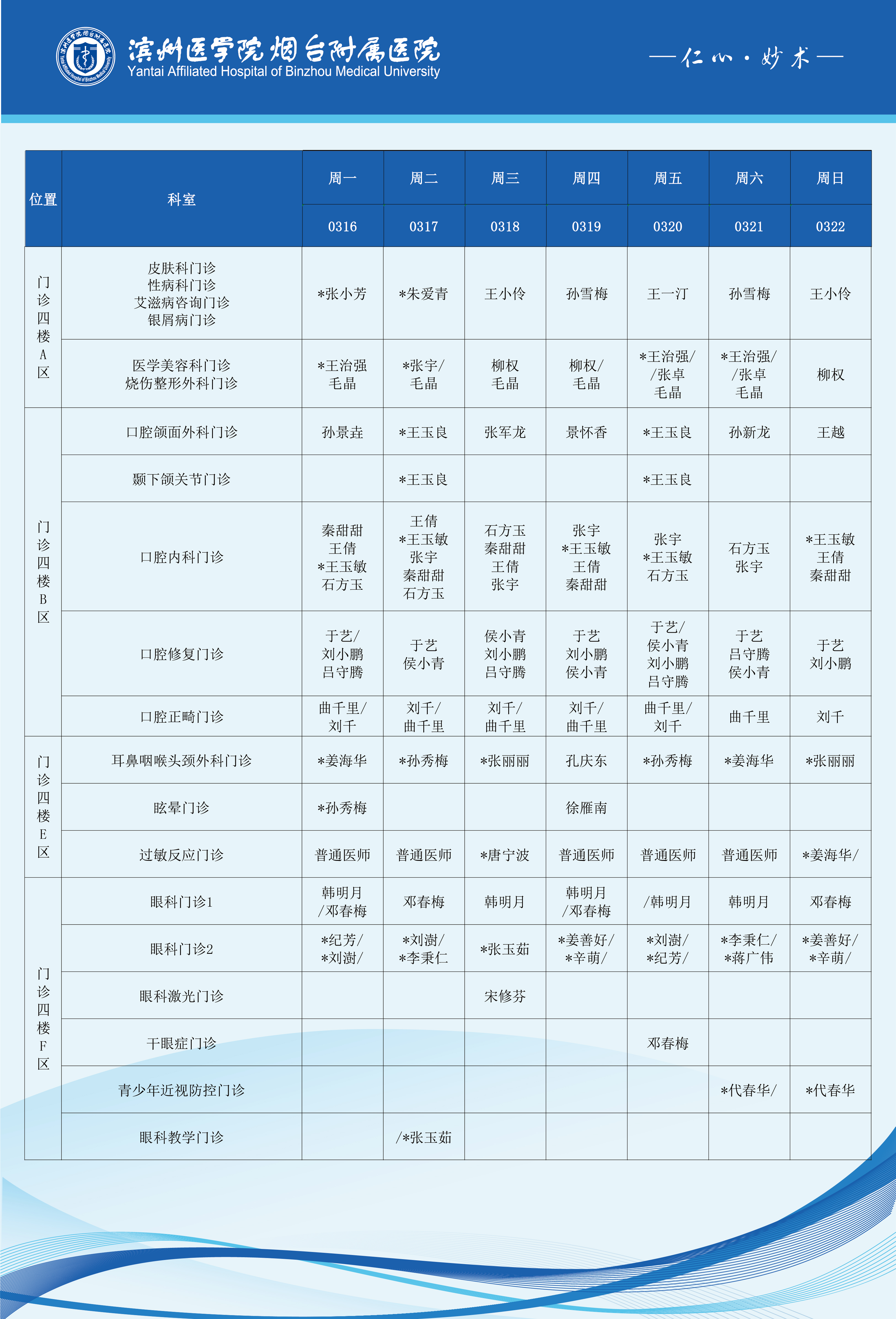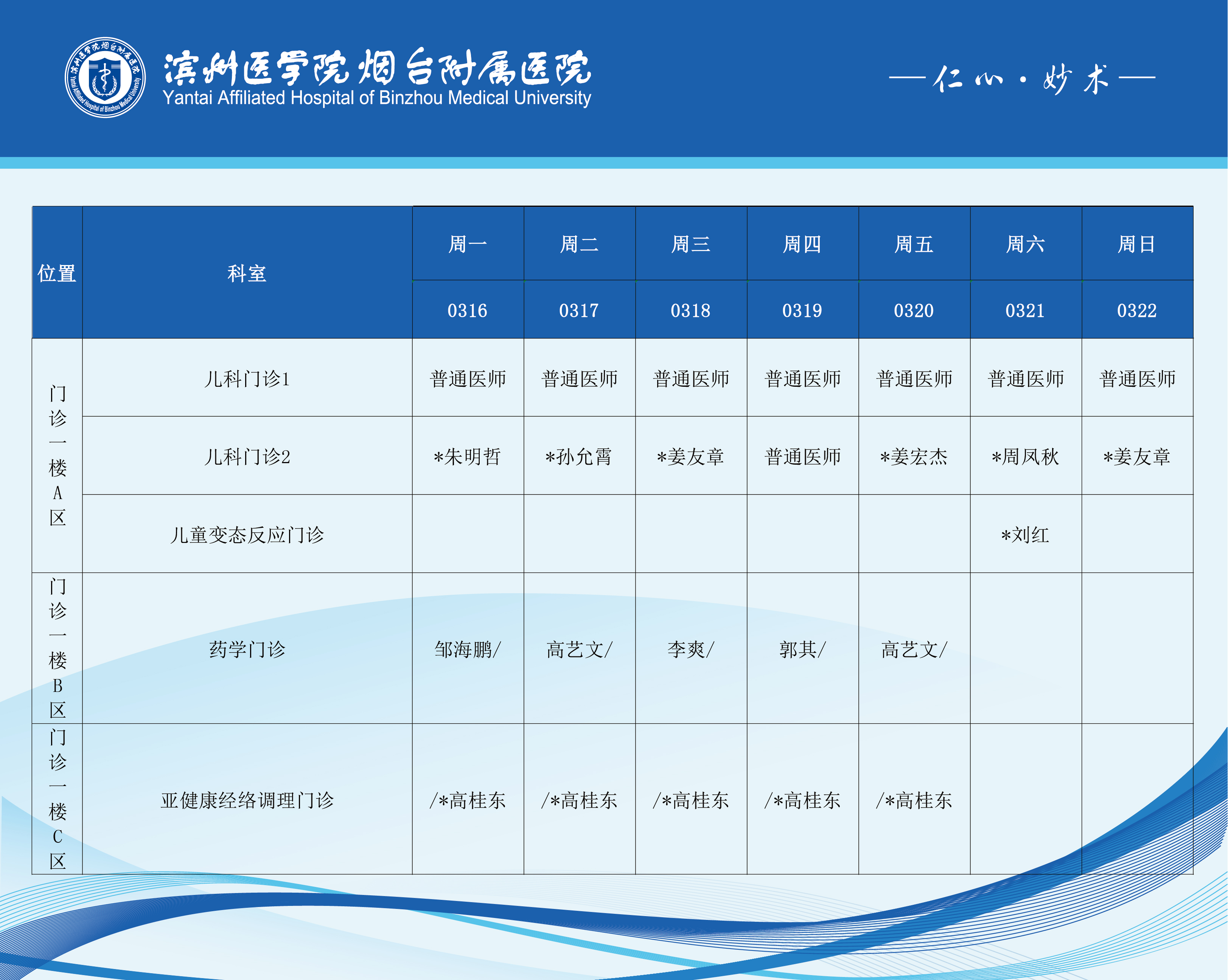 滨州医学院烟台附属医院2026年3月16日-3月22日门诊医师坐诊表