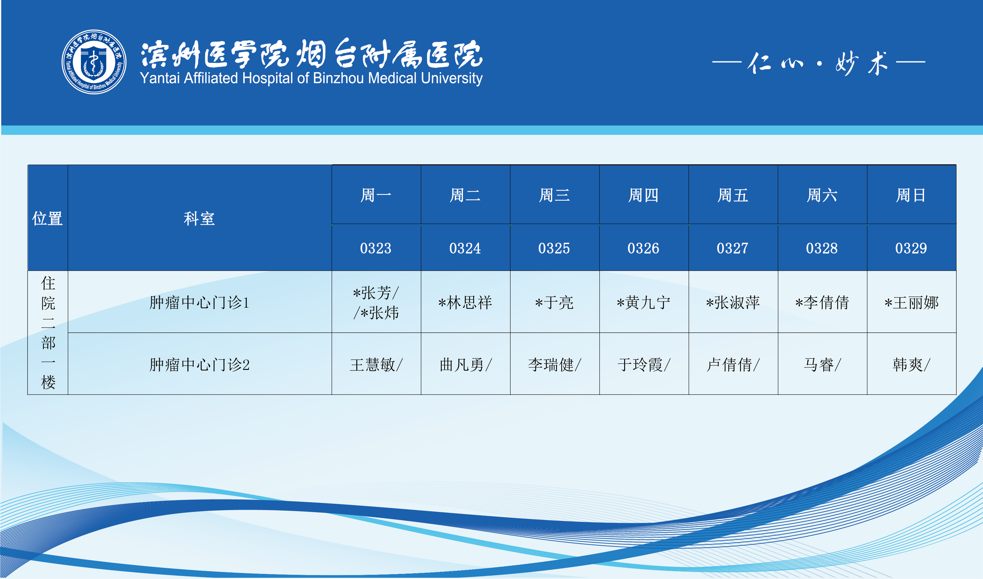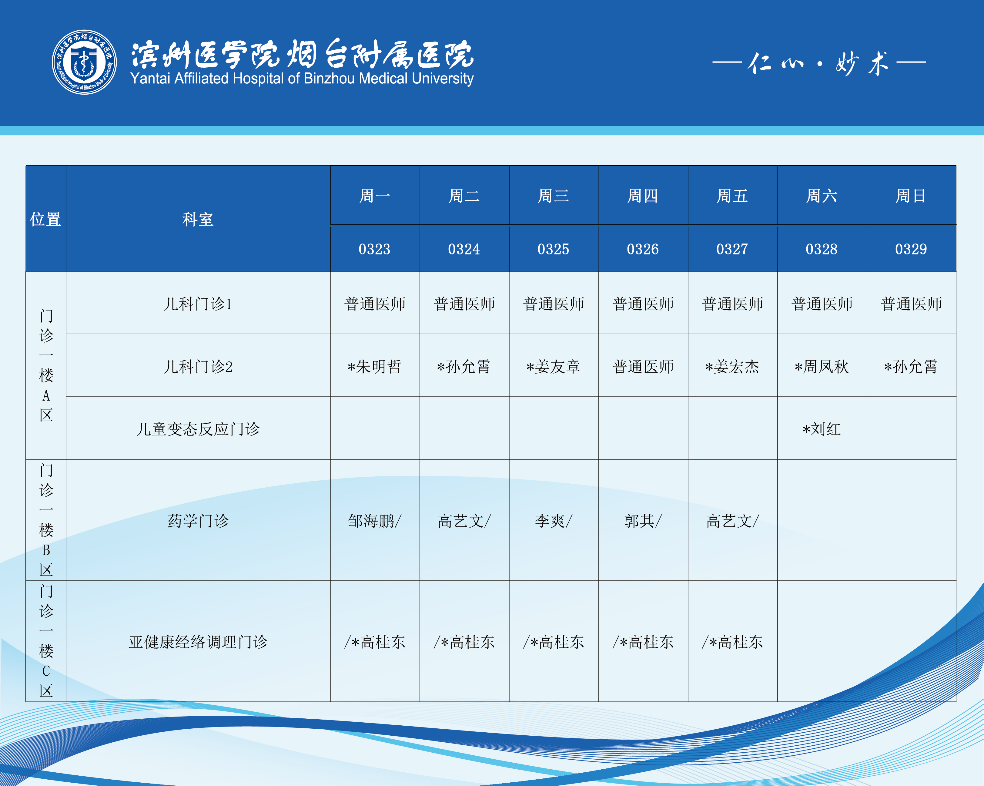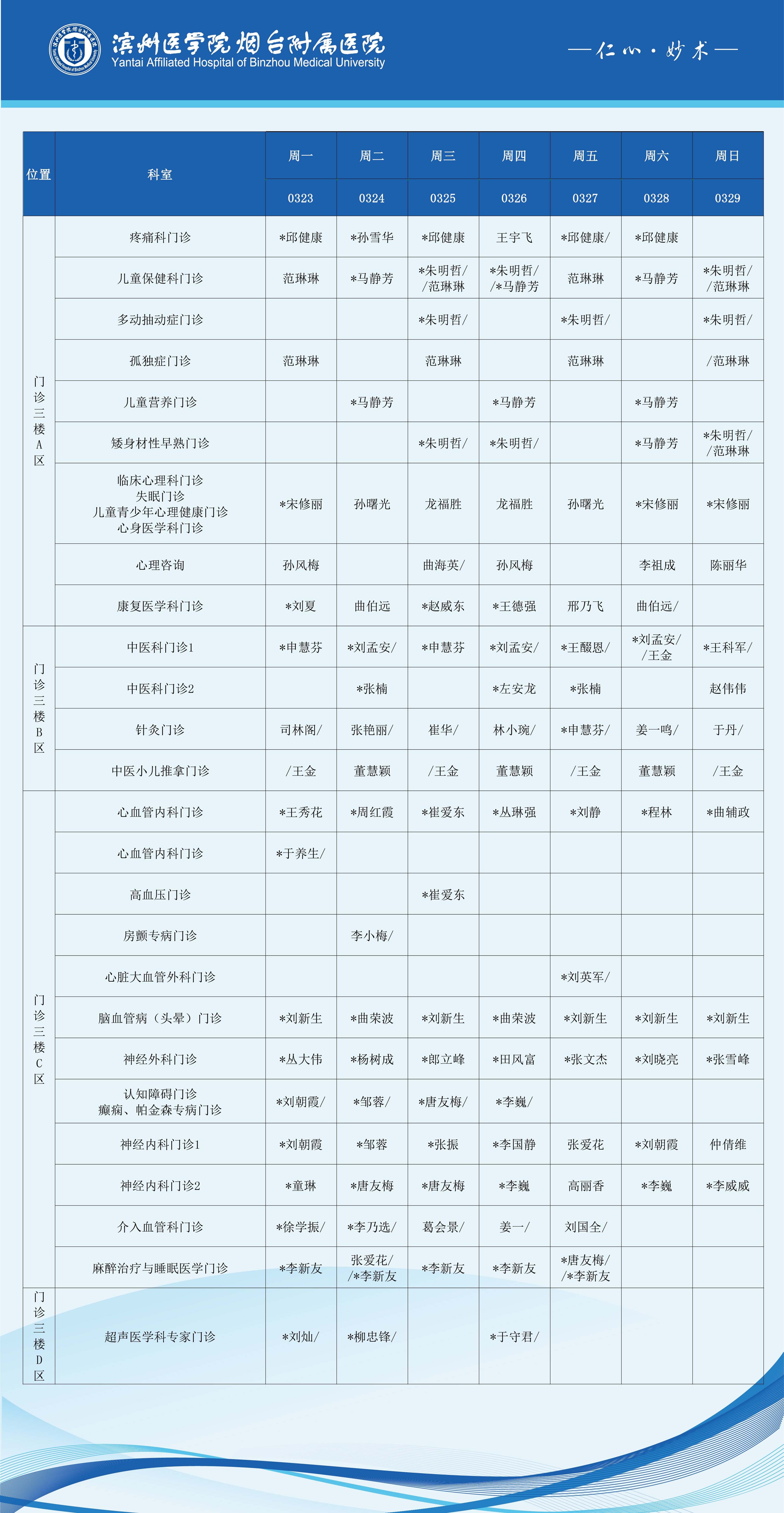 滨州医学院烟台附属医院2026年3月23日-3月29日门诊医师坐诊表
