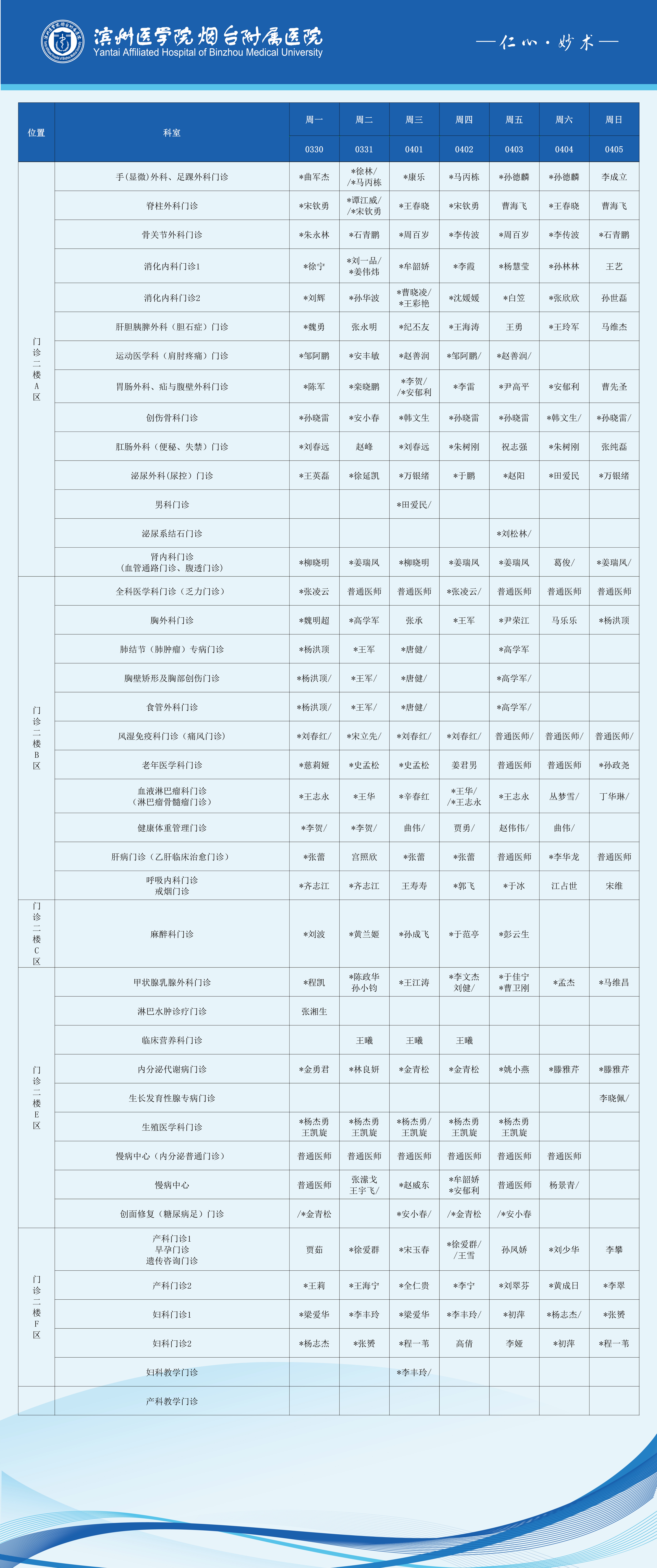 滨州医学院烟台附属医院2026年3月30日-4月5日门诊医师坐诊表